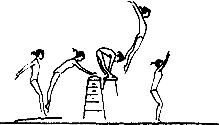 | 释义 | 跳上成分腿立撑挺身跳下跳起,分腿立撑在器械上,随即挺身跳下的动作。动作要领:起跳后,两臂前摆,稍含胸,收腹,手撑器械时向上提臀、顶肩,两腿伸直向侧分开成立撑姿势。然后两脚向侧后下方蹬离器械,同时两臂向前上摆,上体抬起成分腿挺身姿势腾起,立即并拢腿缓冲落地。保护与帮助:保护者站在器械正前方,当练习者手撑器械时,握住其上臂帮助顶肩;当其跳下时,在侧面扶其腹背。教学重点:在地上俯撑,做后摆腿成分腿立撑,然后挺身跳起的动作。随后在器械上做完整动作练习。