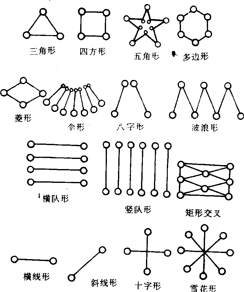 是将多条皮筋,由多人拉开组成的图案。如三角形、四方形、五角形、多边形、菱形、伞形、人字形、八字形、波浪形、雪花形和十字形等。跳者可先选择图案,再考虑队形,然后编排动作组合。