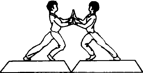 游戏方法 把学生分成人数相等的两个组, 分别站在跳箱两侧。各组第一名学生上到跳箱盖上, 前脚踏在相接处,两手互推。教师发出开始口令后,双方用拉、推、左右用力等动作迫使对手掉下箱盖。胜者得2分。然后各组第二个学生按上述方法进行, 最后以全组积分多者为胜。 游戏规则 ❶比赛开始后,各自只能用两手相搏,不能用头顶撞。 ❷在两人角头中, 各自双脚不能移动,先移动者为失败。 |
