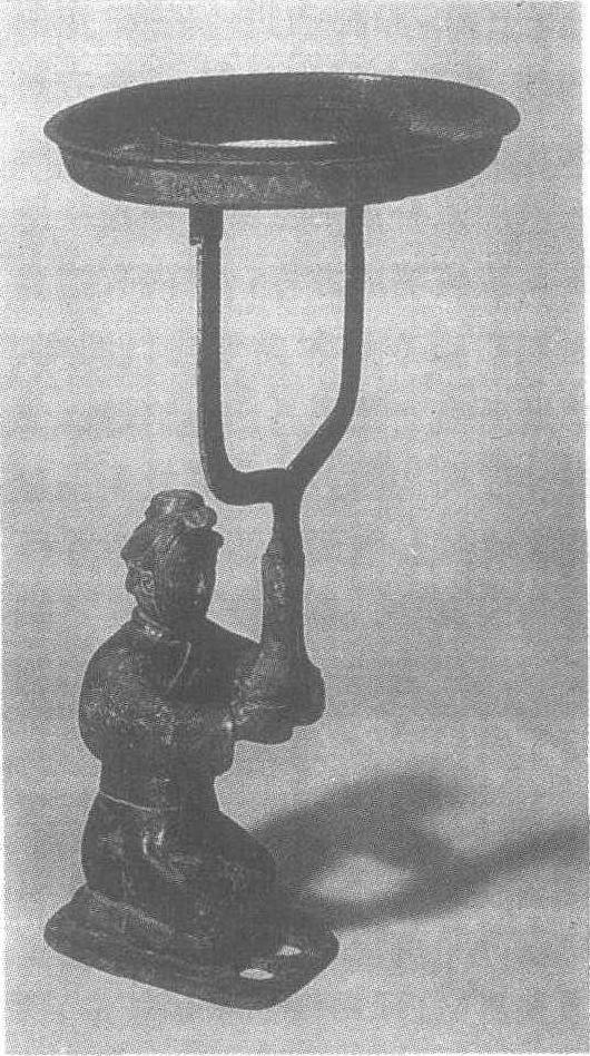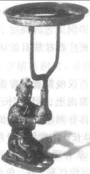 跽坐人漆绘铜灯战国时期铜灯具,河南省三门峡市上村岭战国墓出土。通高四十八点九厘米,盘径三十二点七厘米,重七千五百克。此灯为分段铸造,头和躯体系分铸后铆合成一体,俑作跽坐姿态双手伸于胸前。灯盘圆形,盘内有三个尖钉形烛座,可以同时承蜡三只。灯盘下有Y形把柄,下端插入双手持的构件上端的方鋬内。灯盘外缘髹有三角纹彩漆,把柄表面原来髹有朱色漆现仅见到少量残迹,制作精湛,造型新颖,是战国灯具的精品。现藏于河南省博物馆。