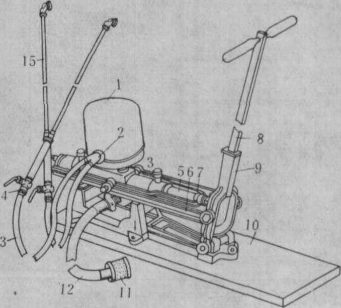 双缸双动踏板式喷雾器 1.空气室; 2.三通; 3.缸体; 4.机座; 5.柱塞; 6.连杆; 7.框架; 8.摇杆; 9.杠杆; 10.踏板; 11.过滤网;12.吸液软管; 13.喷雾软管; 14.截流阀; 15.手持喷杆 |