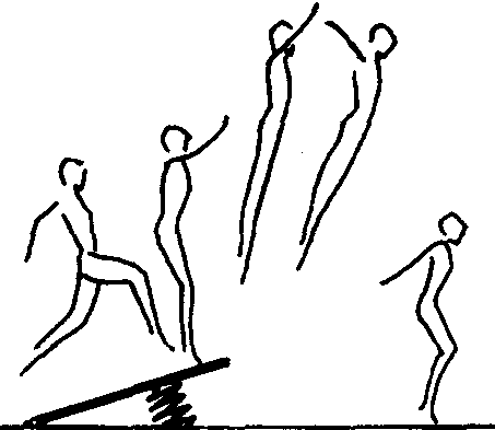 | 释义 | 踏跳挺身跳蹬踏弹板,使身体成挺身姿势腾空动作。动作要领:助跑,上板时腿稍屈,两臂由后经下向前上方摆,同时两腿用力伸直膝、髋关节下压弹板,利用弹板反弹力使身体向前上方腾起,两臂侧前上举、梗头、挺胸成挺身姿势,然后缓冲落地。保护与帮助:保护者站在练习者落地点侧面,当其落地时,用手扶其腹背。教学重点:站在弹板上做挺身跳下动作,然后加助跑、踏跳做完整动作练习。