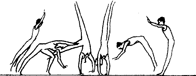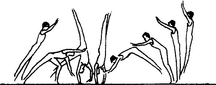 小翻踺子 空翻的侧手翻内转90°)。助跑,节奏跳(趋步)后,两手撑地点远于第一种做法。在转体推手后,腿要向远处以前脚掌主动蹬地,迅速伸直膝关节,同时向上领臂、立腰、梗颈向上跳起。空翻踺子教学重点:❶由手倒立开始,两手推地,同时弯曲髋关节,脚向远处蹬踏地,同时向上领臂、跳起,体会推手脚落地跳起的协调用力技术。❷在帮助下做完整动作练习。
