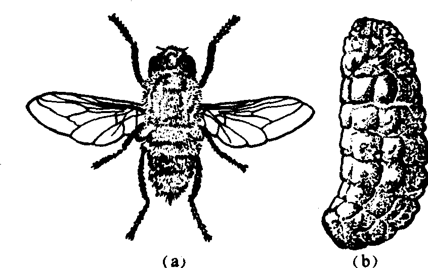 | 释义 | 蹦虫病cattle grubs蹦虫(即皮蝇幼虫)寄生于耕牛或牦牛背部皮下所引起的慢性病证。《抱犊集》中记载:“凡牛皮内裂起者,砂虫蛀皮也。”赵学敏在《串雅》中提出: “牛身上生虫, 当归捣烂, 醋浸一宿,涂之。”皮蝇幼虫在牛背皮下形成小疱,疱顶有小孔,用手挤压, 虫即从孔洞中蹦出, 故名蹦虫病, 现代兽医学称牛皮蝇病。多因牛只在夏季晴天放牧时受到蹦虫成蝇(图a)的侵袭产卵,幼虫经毛孔钻入皮内, 向牛背部移行。蹦虫的成虫, 形如蜂、短胖多绒毛,橙黄色,飞在牛体背部、腹部或后腿内侧等处的被毛上产卵, 发育为幼虫, 钻入皮下, 随后移向背部, 穿破皮肤而蹦出。幼虫形如蛆(图b),落地钻入土中, 变成蛹,经1~2月后羽化为成蝇,飞翔产卵。证见牛只恐惧不安, 摇头摆尾, 踢蹴; 不久幼虫钻入皮下, 浑身发痒。以后在背部皮下幼虫寄生部位形成指头大的隆起硬结, 并形成绿豆大的皮孔, 幼虫从皮孔中钻出。有时破溃出血, 或感染化脓, 形成瘘管。愈后形成硬结瘢痕。治宜杀虫。选用验方当归醋浸液涂擦(取当归2000克,放入4 000毫升食醋中浸泡48小时,背部涂擦, 大牛每次150毫升, 小牛80毫升)。或用60度白酒在蹦虫寄生部位的硬结周围作点状注射。或针刺寄生部位后, 用白酒涂擦。发现幼虫穿破皮肤后, 可用盐水注入伤口进行冲洗。经常保持牛体清洁, 勤于洗刷被毛, 以防蹦虫寄生。如背上已形成隆起小疱,除用上法治疗外,也可用手挤出, 挤出的蹦虫应立即杀死。