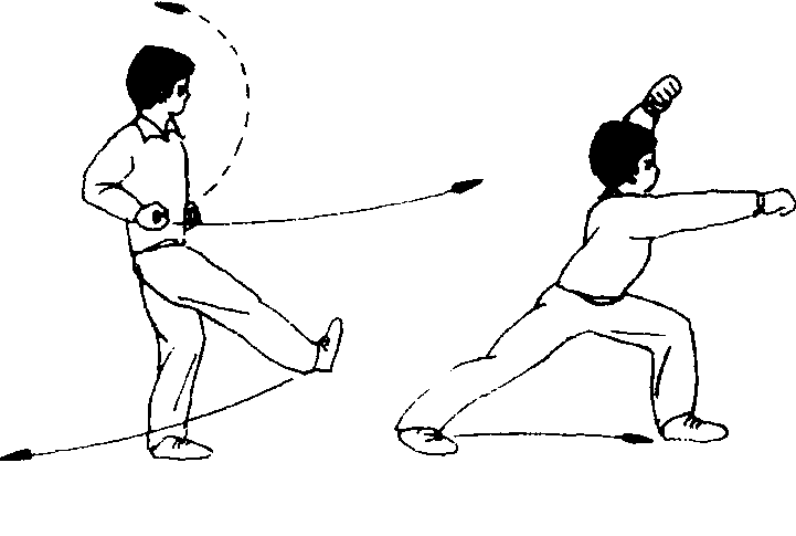 第一套少年拳动作之二。为蹬腿和架打依次迅速完成的拳术动作。教学重点 强调:❶蹬腿时脚尖要尽量上勾,以脚跟为力点,同时右拳回收,左小臂下压要有力。❷撤右腿时,左腿应屈膝并向后蹬地,同时完成左架右打。