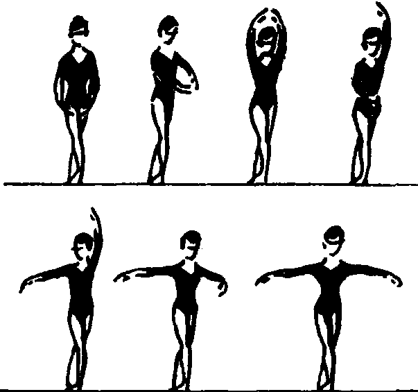 此外手臂还常采用芭蕾舞的形态和位置,其要求:肩放松,肘、腕自然微屈,手臂呈弧形,手指自然并拢伸长,拇指和中指相靠并向里合。 芭蕾舞手臂的7个基本位置: