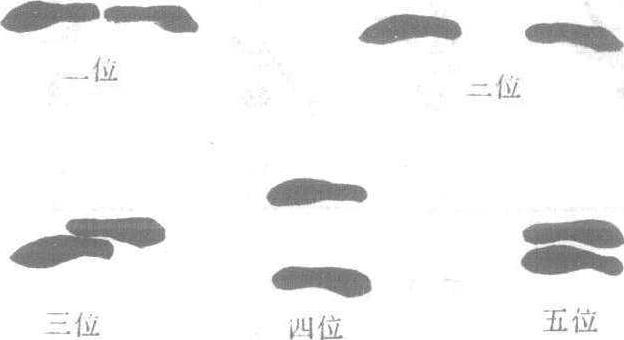 ❹脚的基本部位练习:韵律体操中常用的脚位有:自然位(八字步);开立(大八字步);丁字步(一脚跟在另一脚弓处),点立(一脚站立,另一脚向前、侧、后点地)芭蕾舞脚的5个基本位置:1位:两脚跟靠拢、