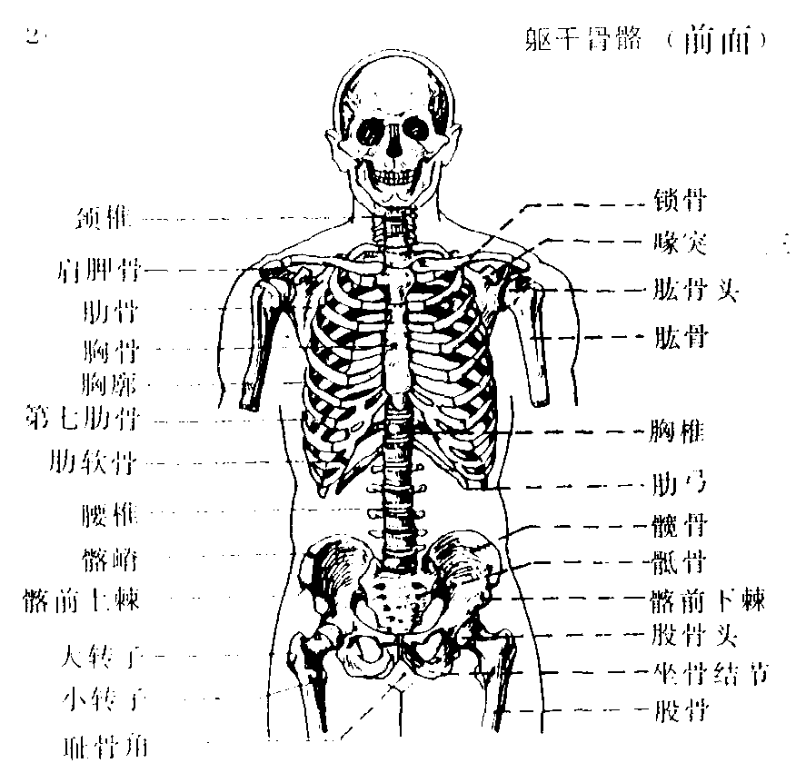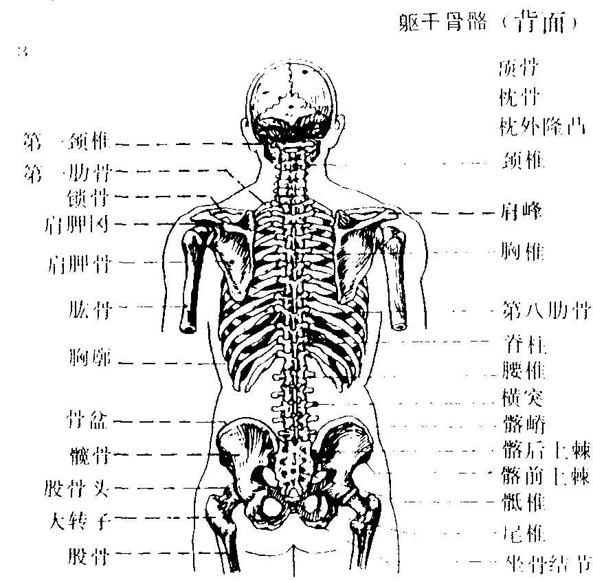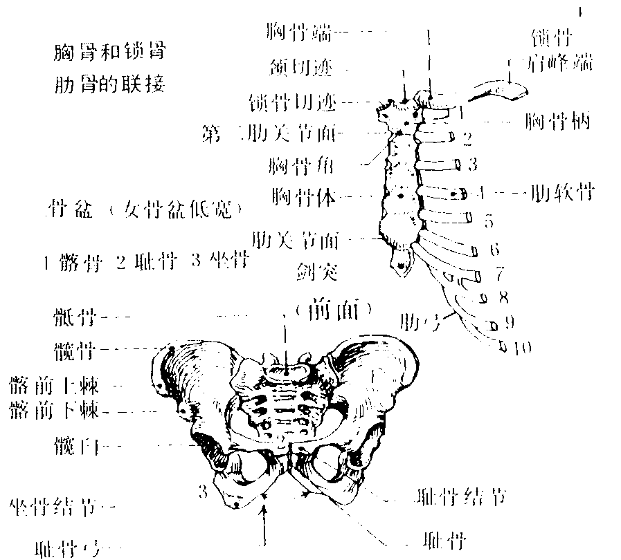 | 释义 | 躯干骨分为脊柱、胸廓、骨盆三部分。脊柱又分为颈、胸、腰、骶、尾等椎骨。脊柱从上到下成为两前两后的弯曲形状,使直立的脊柱具有弹性的结构,颈椎、腰椎旁边不长肋骨,能作较大的活动。胸廓是呈扁圆形,前后扁,左右宽,上口尖,下口宽圆;后面是胸椎,前面是胸骨,每边有12条肋骨,肋骨又分肋骨和肋软骨,连接的边缘形成肋弓;每边有7条肋骨连接胸骨,8~10三肋互相连接前一肋骨,10~11两肋不连胸骨。骨盆形似盆,由下肢的两髋骨前面互相联合,后面连接骶骨、尾骨围成一个骨环。男的骨盆高而窄。女的骨盆低而宽,两髂前上棘间距宽,从侧面看较倾斜(见图3