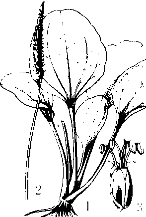 车前 1. 植株 2. 花序 3.花 车前别名车前草、车轱辘菜、驴耳朵菜、打官司草、牛舌、牛遇、车轮草、白带草、当道、蛤蟆草。多年生草本,高10—50厘米。叶基生,叶卵形或椭圆形。穗状花序,花小,淡绿色。全疆均有分布。具有清热解毒、止咳化痰、利尿止泻、明目的功能。药用种子和全草。主治小便不利、尿道涩痛、腹泻、眼红肿痛、怕光流泪、慢性支气管炎、肝炎、黄疸、皮肤肿毒初起等病症。亦可作杀虫植物,对蚜虫、红蜘蛛有杀虫作用。 |