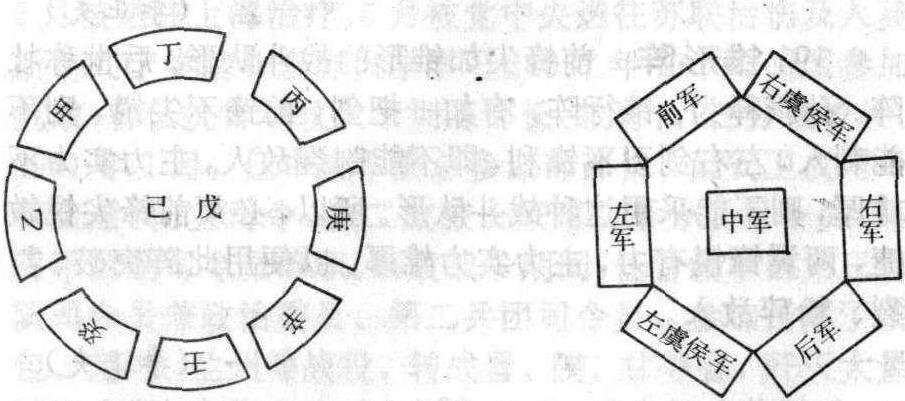 环形防御队形。即圆阵。亦称六花阵。据《通典》卷一五七引语说:“诸逢平原广泽,无险可恃,即作方营……中军在中央,六军总营在四畔,像六出花。”防御时,还可成圆阵。据《武备志》卷六十:“李靖内画之圆,外画之方,大花阵图”及卷五四 《裴绪演孙武圆阵》,分别画下列示意图。