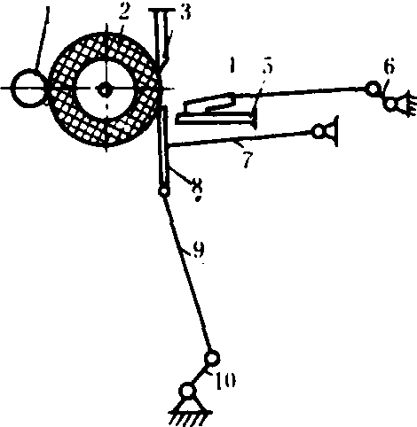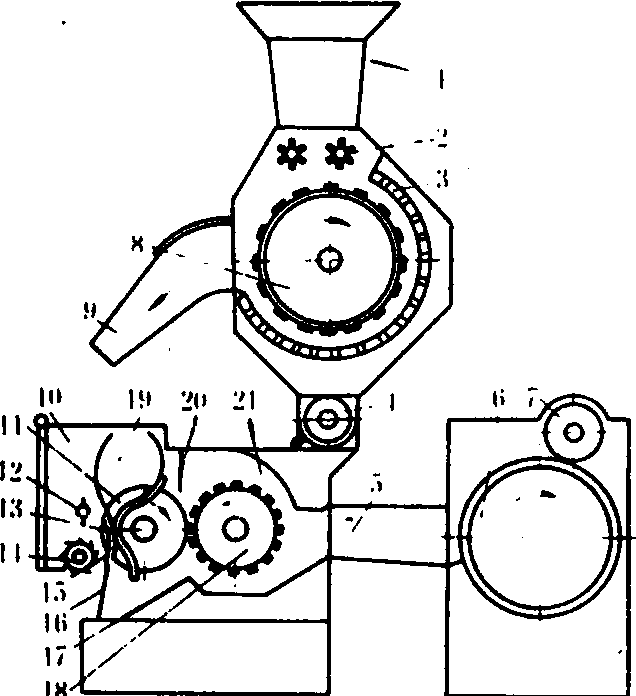 图1 冲刀式皮辊轧花机工作原理图 1.拨棉辊; 2.皮辊;3.定刀;4.推花板;5.棉籽栅;6.推花板曲轴;7.撑杆;8.动刀;9.连杆;10.动刀曲轴 皮辊轧花机有多种型式。常用的是冲刀式皮辊轧花机,其结构及工作原理如图1所示。当籽棉被喂入推花板前端的棉籽栅上时,推花板作前后往复运动,将籽棉推向定刀和动刀之间的皮辊表面,定刀对皮辊有适当压力,动刀依靠曲轴的转动作上下往复运动,配合推花板冲击籽棉,旋转的皮辊表面粗涩而富有弹性,将籽棉上的长纤维牵引至定刀口内,附在皮辊表面转出,落入集棉箱,棉籽被阻隔在定刀口,经棉籽栅落下。由于皮辊轧花机是依靠皮辊转动拉取棉纤维,作用力比较缓和,不易拉断棉纤维,而且棉结、索丝少,轧花质量好,所以适合加工长绒棉,但工作效率低,轧出的皮棉色泽较差。 皮辊轧花机皮辊一般为钢轴外包木材作衬,外层主要用旧轮胎或胶布条,也可用脱脂牛皮或牛皮夹橡胶带裹紧。所轧皮棉等级与皮辊材料摩擦系数大小有关。常用的皮辊轧花机的皮辊长度有400、600、700、800、900毫米等规格,前2种一般用作收购棉花时的衣分试轧,后3种用以加工长绒棉和低级棉。有些国家还有较大型的皮辊轧花机(皮辊长1016~1232毫米)、滚刀式皮辊轧花机和双皮辊双冲刀轧花机,用以提高生产率。滚刀式皮辊轧花机主要是用滚刀代替冲刀式皮辊轧花机的动刀,使产量大幅度提高,主要用于加工纤维长度为32毫米以上的棉花。 锯齿轧花机 常用的有毛刷式和气流式两种类型。锯齿轧花机的主要部件是锯片辊筒,由若干锯片和隔圈间隔安装在轴上,两端装有压环,用螺母固定。锯齿辊筒转速为700~850转/分。一般锯片直径为320毫米,厚度1毫米,齿数为304齿,齿形角20°。锯齿轧花机的生产率常以每个锯片每小时皮棉产量——片时产量表示。 毛刷式锯齿轧花机 由清花、轧花、集棉3个主要部分组成(图2)。送入盛花斗的籽棉.由喂花辊均匀地喂入,受到清花刺辊的冲击而松解,部分杂质通过排杂网由排杂螺旋排出,完成清花作业; 抖松的籽棉沿淌花板进入前厢,再由拨花翼辊送至伸出阻壳肋条的锯片钩取,随锯片旋转而带人中厢,形成转动的籽棉卷; 锯片从轧花肋条排的间隙中将籽棉卷中的纤维钩出并送入后厢,由于相邻肋条间隙(2.7~3.0毫米)小于棉籽的短径,只能让锯片和棉纤维通过,而棉籽被肋条阻留在中厢内,使其与棉纤维分离,完成轧花过程。锯片上钩取的棉纤维被反向高速旋转的毛刷辊筒刷下,经皮棉管道送往集棉尘笼或直接由皮棉管道送往打包机打包;或进入皮棉清理机。纤维中残留的不孕籽、破籽壳等杂质,一部分通过轧花机肋条抛向前挡风板,从锯片间落下;一部分被毛刷辊筒刷下后,在排杂调节板前与纤维分离,抛出机外。