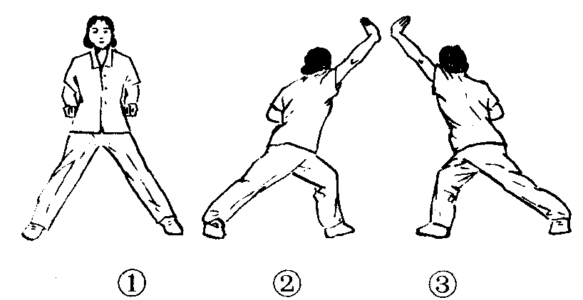 练功十八法第4套第4节。动作过程:两腿直立,两手握拳于腰间,然后分开一大步。(图2—4—142—❶)身体向左后转体成左弓步,目视左肩,同时右手向前上方推掌,右臂与右腿成一直线。(图2—4—142—❷)❷还原成预备姿势。❸~❹动作与❶~❷相同,方向相反。(图2—4—142—❸)共做4个8拍。注意事项:上体左转时以左脚跟为轴,右脚不动。弓步时后脚脚跟不得离地,此功法对四肢关节及肩、腰、腿酸痛有一定治疗效果。
