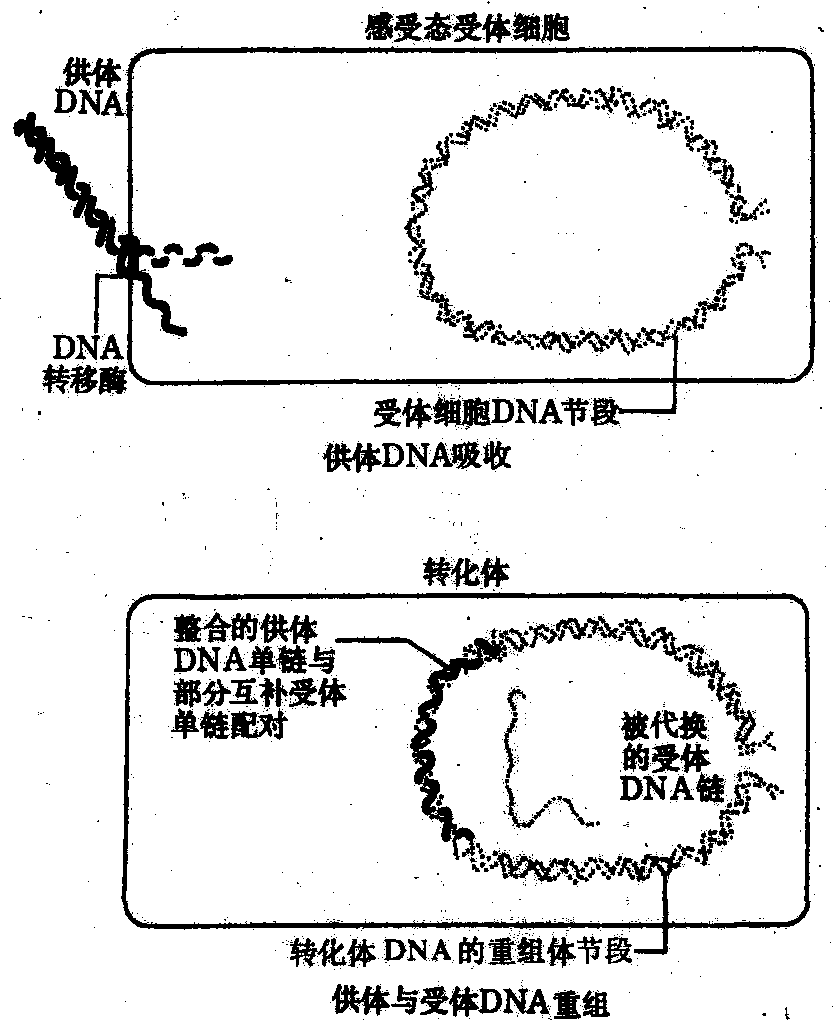 细菌转化过程示意图 质粒DNA也可以转化,通常没有染色体DNA转化率高。如果先用一定浓度的钙离子处理大肠杆菌细胞(受体),可以提高转化效率。质粒DNA很容易进入去掉细胞壁的细菌原生质体,说明它的吸收并不通过专门的接受位点。此外,质粒的转化不需要整合到受体细菌的染色体上。遗传工程中常用质粒作为载体,将外缘DNA引入受体细胞。 真核生物酵母菌,链孢子霉和植物细胞用酶处理使细胞壁解体便能有效地转化。例如把固氮基因引入酵母菌,用Ti质粒为载体将法国云豆蛋白基因引入向日葵等。高等动物的转化率远远低于细菌。转化实验在离体条件下进行,实验的成功与否常常取决于标记性状和选择性培养基的使用。至今已在小鼠细胞、鸡胚细胞、果蝇细胞和人的海拉细胞转化成功。 用除去蛋白质外壳的病毒核酸感染细菌或真核生物原生质体的过程称为转染。转染是转化的一种特殊形式。由致癌的RNA或DNA病毒感染真核细胞,病毒基因组往往整合到被转化的细胞的染色体上而表现癌变现象。这对癌基因致癌机理的研究有重要意义。 转化个人改变原有的生活方式和观念体系,自觉适应新的行为模式和社会环境的过程。 转化某一基因型的细胞从环境中吸收来自另一基因型细胞的DNA,使原基因型和形型发生相应变化的现象。转化现象的研究首次证明遗传物质是DNA而不是蛋白质。在基因工程中是将重组DNA分子引入宿主细胞的重要手段之一。 转化矛盾双方之间相互斗争,在一定条件下走向自己的反面。包括前进、上升和倒退、衰败。一般说来,其趋势是前进和上升的。转化是绝对的,世界上没有永恒不变的事物,但须具备一定的条件。 转化transformation某一品系的细胞因摄取外源DNA而引起基因型和表型发生相应变化的现象。1928年英国学者格里费斯(F.Griffith),首先在肺炎双球菌中发现。直接证明了DNA是遗传物质。细菌的转化过程包括吸附、吸收和整合3个阶段。质粒DNA也可转化,但不同于染色体DNA的转化,常用作遗传工程中的载体,把外源DNA引入受体细胞。真核生物受RNA或DNA病毒感染而发生可遗传的变异称为转染,是转化的一种。酵母菌、链孢霉和植物细胞也都转化成功,例如将法国云豆蛋白基因引入向日葵等,可望成为育种的新途径。高等动物及人类的细胞在离体培养下也有能转化的,这对癌基因和致癌机理的研究有重要意义。 |