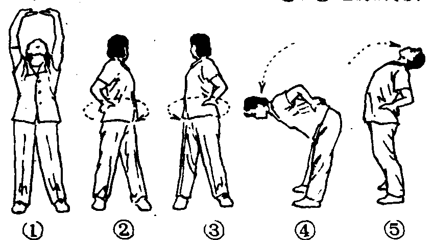 练功十八法第6套第5节。动作过程:两脚分立,两手握拳收于腰间。❶两手变掌翻掌上托,目视手背。(图2—4—154—❶)❷两臂经体侧下落,两手叉腰,拇指向前。❸上体向左后转,目视左后方。(图2—4—154—❷)❹上体向右后转,目视右后方。(图2—4—154—❸)❺还原成两手叉腰,目视前方。❻上体前俯。(图2—4—154—❹)❼上体后仰。(图2—4—154—❺)❽还原成预备姿势。共做4个8拍。注意事项:转体时两脚不得转动,前俯和后仰动作时两膝要伸直。此功法对于体虚肾亏、腰酸背痛者有一定疗效。