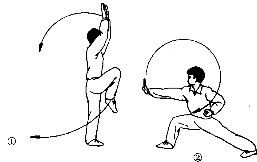 第二套少年拳动作之十。为转身后劈掌的拳术动作。教学重点 强调:❶转身以左脚掌为轴,提右膝的同时两掌在头上击响。❷落步劈右掌和左掌收至拳位要同时完成。