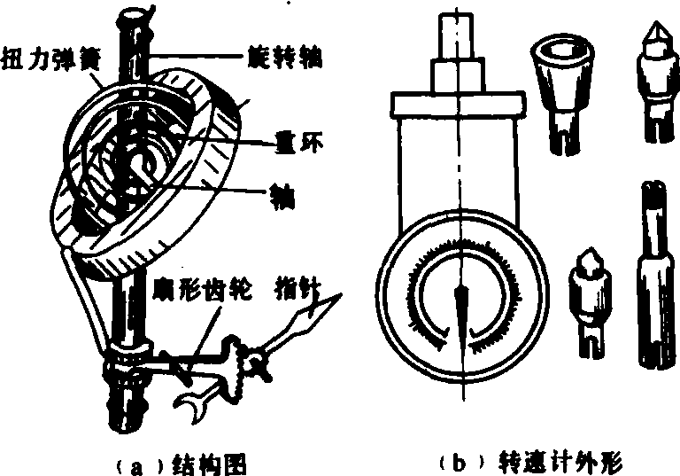 图1 离心式转速计 磁性式转速计 利用电磁感应原理,把转速变为转角进行测量的仪器(图2)。磁感应系统由旋转磁钢和固定在指针轴上的铝盘组成。当转速计转轴与被测件相接,磁钢同步旋转,由于磁力线为磁盘切割,磁盘上感应电势产生电流,它与磁钢的旋转磁场相互作用,形成能带动指针轴偏转的力矩,由指针指示出被测转速值。这种转速计结构简单,维护方便,可以正、反旋转。