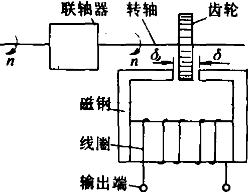 图2 磁性式转速计原理示意图 磁阻式转速计 根据磁阻变化生产感应电势的原理测量转速的仪器(图3)。当被测件转轴通过联轴器,带动齿轮旋转,齿轮的轮齿,依次切割永久磁钢的磁力线,引起磁阻的变化,使线圈感应出脉冲电动势,感应电动势的频率与被测转速成正比,通过二次仪表就可以指示出被测转速值。这种仪表适用于高速件的测量。