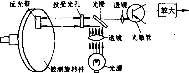 图3 磁阻式转速计原理示意图 光电式转速计 利用光电效应原理测量转速的仪器(图4)。采用一套光学系统,由光源发出光线,经透镜聚焦,通过光栅由投受光孔射出,照到被测旋转件上的反光带上,光线再由反光带反射到投受光孔,经透镜聚焦而射到光敏管上,使光敏元件感光。这样转轴每旋转一圈,反光带反射一个光点,光敏元件感光一次,发出一个脉冲信号。这个电脉冲信号经脉冲放大、整形,由单稳电路输出信号,显示装置就显示出相应的被测转速值。这种仪表不与被测对象直接接触,不增加被测件的负荷,使用方便,具有较高灵敏度和较宽的频率范围。但光学系统对使用环境有一定要求。