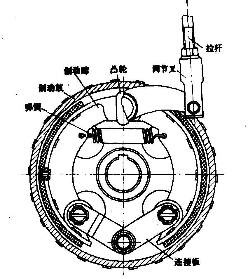 图1 蹄式制动器 盘式制动器分为干式和湿式两种,干式多采用铜丝石棉摩擦衬面、散热和平顺性较差,要求密封以防止油水浸入。湿式的浸在传动系润滑油中,一般采用粉末冶金或纸质摩擦片,工作可靠,使用寿命长。由于浸在油中摩擦系数较小,需增加摩擦片数目,或增大压紧力。