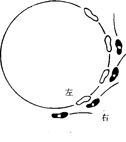 ❷短步转弯:在以上动作基础上,姿势较低,重心完全在左腿上甚至超出左腿左侧,右脚向右侧蹬地后迅速收回靠近左脚落地做非常短暂支撑重心时,左脚迅速向左稍转脚尖方向,右脚再迅速蹬出, 连续做。向右转弯时方向相反。 教学重点 ❶强调重心的倾倒, 防止上体左倾而臀部向右。 ❷转急弯时身体倾斜大,重心要低,右脚用力帮助支撑重心向左移。 ❸短步转弯时支撑脚踝关节前屈,重心偏向前脚掌,防止后坐动作。左脚左转方向不可过大,以免造成重心外甩。 ❹先练较慢速的短步转弯, 再结合练稍快速的短步转弯和惯性转弯。 |