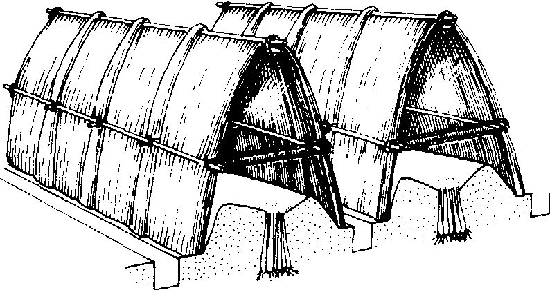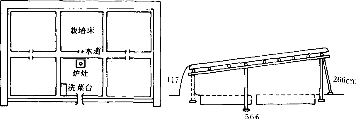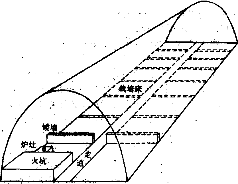 图1 窑洞示意图 用温室软化栽培的:这种温室比一般的栽培温室矮,栽培床较宽,三面为墙,仅南侧为采光面。采光材料一般为油纸或塑料薄膜,夜间加盖草苫。温室中央设有炉灶加温(没有烟道和烟囱),栽培床在地表以下。室内气温可经常保持25℃左右,夜间比白天要高2~3℃。相对湿度75~80%,这样的温室栽植韭菜的根茎,每20天可收割一次青韭。这种温室逐渐减少,而被塑料薄膜温室所代替,但在室内要加盖黑色薄膜或草苫。