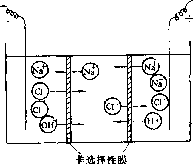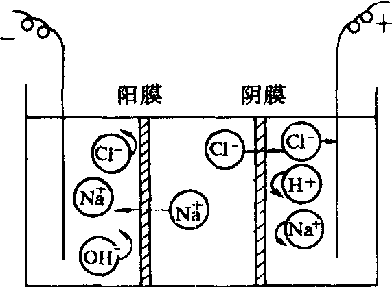 图3 离子交换膜电渗析脱盐示意图 靠近阳极的阴离子交换膜,只允许阴离子通过。阳膜和阴膜将容器分成三室,靠近阴极的称为阴极室,靠近阳极的称为阳极室,这样就构成一个最简单的双膜三室电渗析淡化器。在直流电场作用下,中间隔室中的阳离子,不断穿过阳膜迁移到阴极室,而阴离子不断穿过阴膜迁移到阳极室; 但是,阳极室中的阳离子往阴极迁移时不能穿过阴膜,阴极室中的阴离子往阳极迁移时不能穿过阳膜,结果使中间隔室的水离子含量越来越少,成为淡水。而在两端极室中,由于离子迁入,浓度逐渐升高,成为浓盐水。 |