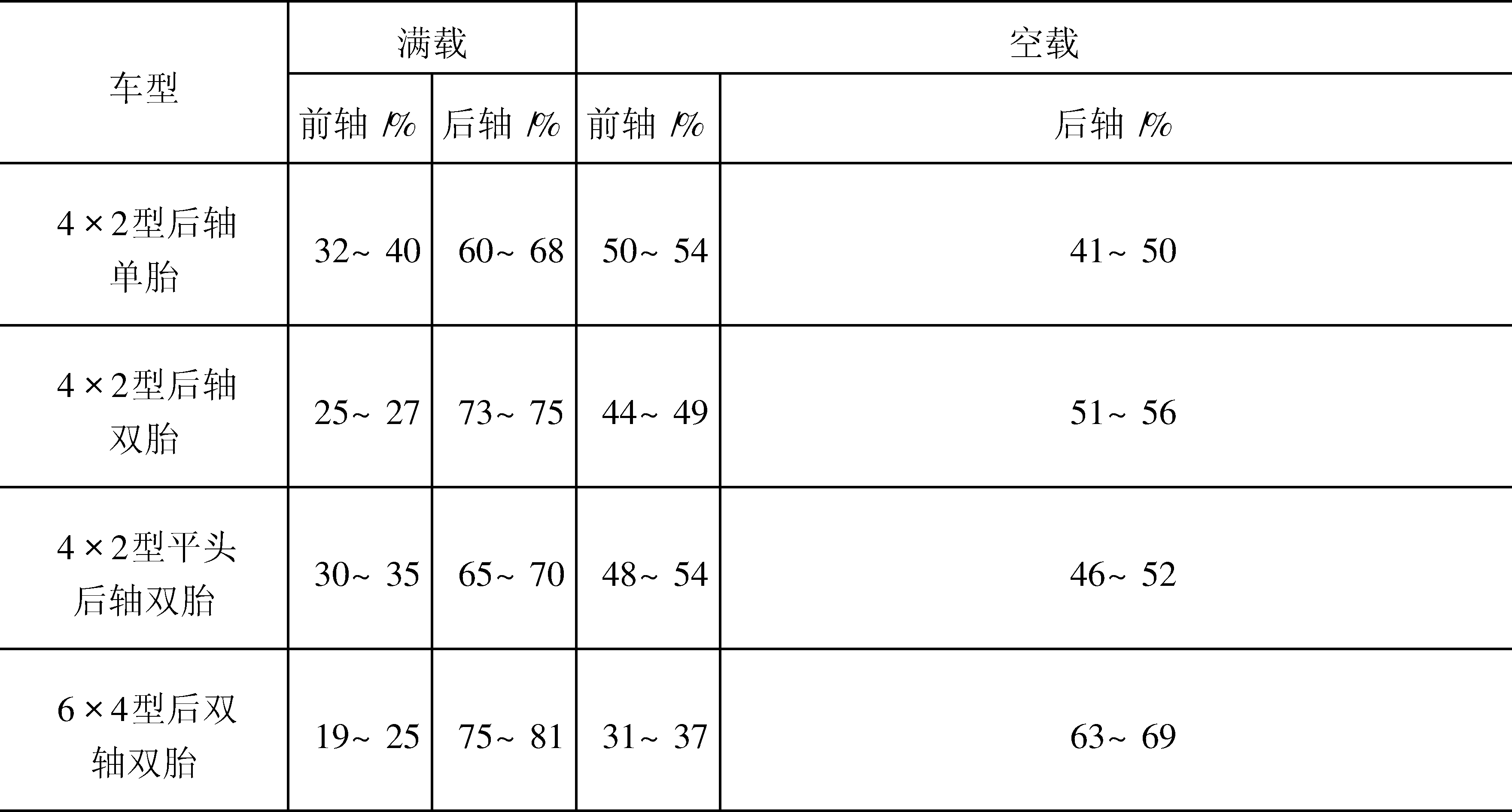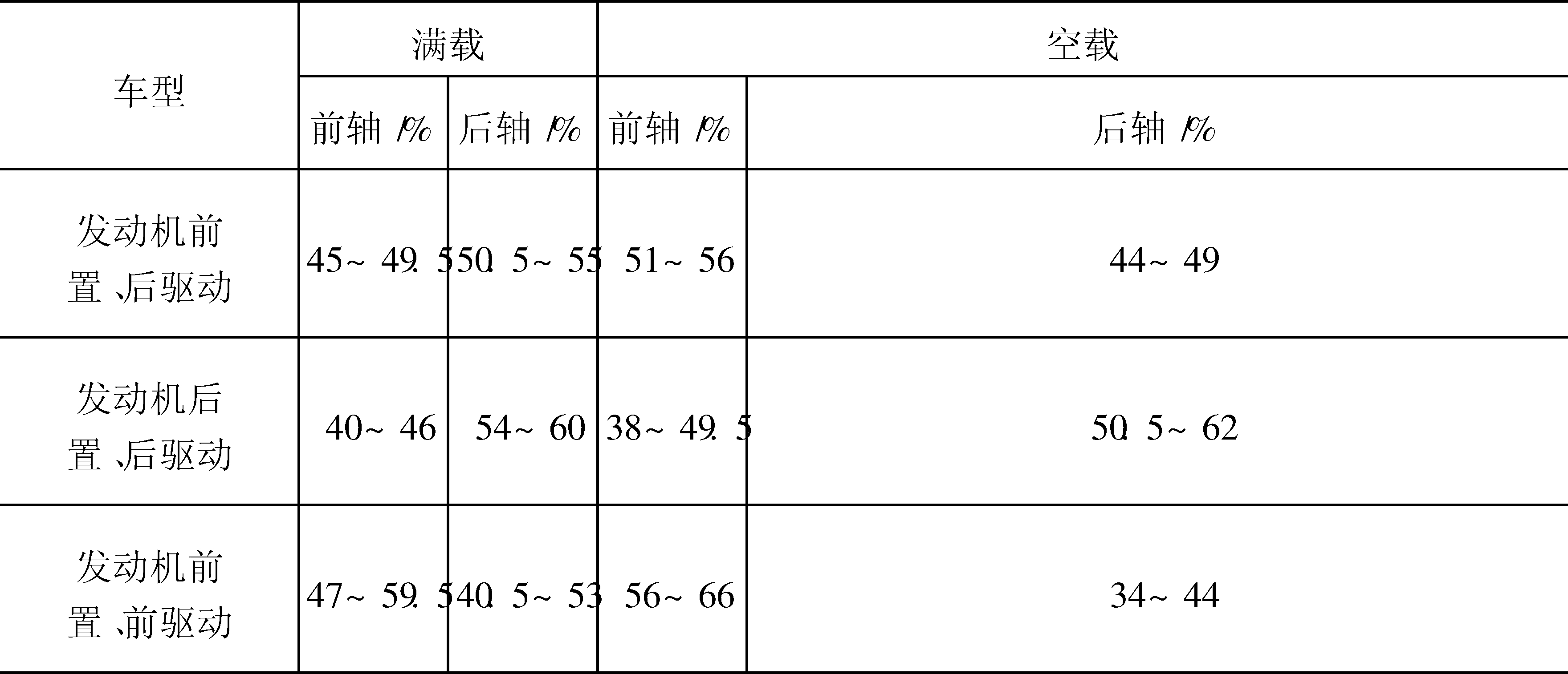 简称“轴荷分配”。汽车各个车轴承载最大“汽车总质量”的合理分配比率。一般分配原则是:❶每只轮胎的负载大致相等,以便磨损均匀。如4×2型汽车前后轴都为单胎车轮时,前后轴的轴载质量比为1∶1;若后轴为双胎拼装车轮时则为1∶2或2∶3。❷保证汽车的制动力、驱动力能够合理利用轴载质量与路面产生的附着力。如短轴距的重型货车,满载高速制动时,因质心高而使整车质量向前轴转移率大,故其后轴轴载质量的分配比率应大一些,以免后轮因附着力小而抱死,出现侧滑、甩尾等不安全的动作。轴载质量的一般分配比率见下表。