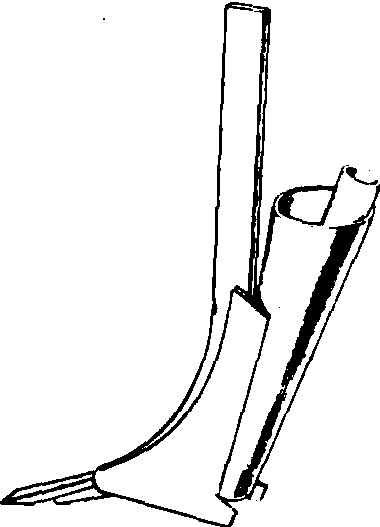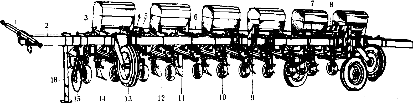 图1 中耕追肥机 1.运输用牵引架;2.主梁;3.肥箱;4.肥箱支架;5.传动机构;6.排肥轴; 7.输肥管;8.运输架; 9.三点悬挂系统;10.仿形轮;11.仿形机构;12.双翼铲;13.地轮;14.施肥开沟器;15.平衡器;16.支架 中耕追肥机与拖拉机的联结多为后悬挂式,以求转向灵活,便于在作物行间作业,伤苗率低。其结构一般由主梁、悬挂架(或快速挂接架)、传动轮、仿形机构、锄铲组、追肥装置等组成。用于窄行距作物的中耕追肥机亦可有对行装置,由一人操向,以便横向对行,减小护苗带宽度。大型宽幅中耕追肥机,通常在机架两侧安装有平衡器(图1),以抵消整机侧向力,保持横向平衡。锄铲组采用平行四杆仿形机构,保证人土稳定性。 主要工作部件 包括土壤工作部件和追肥装置两部分。 土壤工作部件 是中耕追肥机在作物行间进行表土耕作及深施化肥的工作元件,应根据用途、作业条件及作物生长期等农业技术要求设计或选用。有供行间除草用的双翼式、单翼式、双翼通用式除草铲;表层松上用的转动锄;深层松土用的凿式、双尖式、单尖式松土铲;培土起垄用的壁式、旋转式培土起垄器(见行间中耕机械)及施肥所需的施肥开沟器(图2)等。