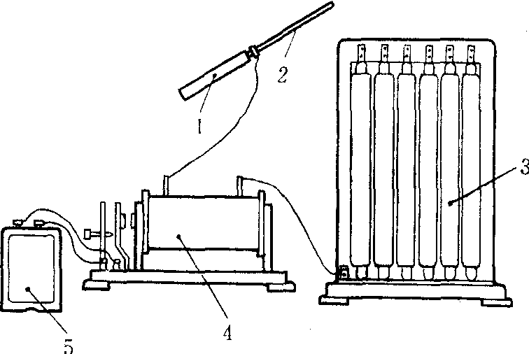 1 绝缘手柄 2 金属杆 3 放电管组4 感应圈 5 蓄电池