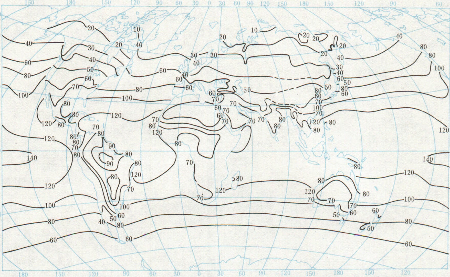 图2 全球净辐射年总量的分布(千卡/厘米2·年 1卡=4.855焦) 地一气系统的净辐射指由地面至大气层顶这一体积内吸收的太阳辐射能与向太空放出长波辐射之差。南北半球各纬度带1、7月和全年平均地一气系统净辐射总量 (千焦/厘米2·年) 分布, 如表。北半球冬季地一气系统净辐射除0~10°N带外全为负值, 纬度越高, 负值越大; 夏季全为正值, 并以中纬度最大; 全年在40° 以下为正。南半球的地—气系统净辐射比北半球大。地一气系统的净辐射减去地表净辐射即为大气净辐射。其值总是负的,主要靠地面输送热量补偿。 地—气系统净辐射总量分布(kJ·cm-2·a-1)