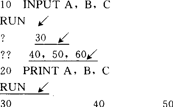 PRINT语句可以一次输出若干个数据项,但数据项之间须用标点(逗号或分号隔开),不同标点的效果如上述。此外,语句名PRINT也可以用问号(?)代替,即 PRINTA与?A将获得同样的运行结果。 键盘输入语句, 语句名为INPUT, 语句格式为〈行号〉INPUT 〔“提示字符串”;〕〈变量名〉〔{〈变量名〉}〕方括号内是可选项。提示字符串可供用户自行设置提示信息。INPUT 可跟若干个变量名, 程序执行到INPUT语句时,若未设置提示信息,则计算机显示问号,等待用户从键盘输入变量的值。键入的值之间应用逗号隔开, 若键入的值的个数少于INPUT后跟的变量个数,则系统将显示两个问号,再次等待输入, 等等。例如, ![]() 第一次键入时,个数不够,系统输出两个问号,继续等待;第二次键入3个数,值的个数已多于变量个数,但这不影响程序的运行,系统自动忽略多余的数据。使用INPUT语句键入数据时还应注意以下两点,即❶键入的数据必须是常量,不能是变量或带有算符的表达式; ❷键入的数据须与对应的变量类型相容。 READ和DATA语句,前者称为读数据语句,后者称为置数据语句, 两者要配合使用, READ语句与INPUT语句格式相同,只是没有提示字符串,其作用也与INPUT语句相同, 是给若干个变量赋值, 但READ语句的执行方式不同于INPUT语句, 不是以交互方式执行。READ语句从置数据语句DATA中读取数据。DATA语句的格式如下: DATA 〔〈常量〉〔{, 〈常量〉}〕〕 DATA语句只提供数据, 是非执行语句, 程序中可以只有DATA语句而无READ语句, 但不可以有READ语句而无DATA语句。READ语句执行方式如下: 当程序开始运行时即自动设置一指针指向第一个DATA语句的第一个数据,READ语句读入指针所指的数据, 读完之后, 指针向前推移一个数据, 若一个DATA语句提供的数据已经读完,则指针移向下一个DATA语句的第一个数据, 例如 10 READ A, B, C 20 DATA 3.14, 2.71 30 READ D 40 DATA 0.56, 0.38 50 PRINT D, C, A, B RUN/ 0. 38 0. 56 3. 14 2. 71 关于DATA语句与READ语句的数据类型匹配问题与INPUT语句相似。 恢复数据区语句RESTORE, 这一语句重新定位数据指针,令它重新指向程序中第一个DATA语句的第一个数据,RESTORE之后的第一个READ语句重新从程序的第一个DATA语句开始读入数据。 BASIC中给变量赋值的语句有3个, 其中LET允许给变量赋表达式与其他变量的值, 因而能够取得程序运行的中间结果, 这是INPUT及READ语句做不到的。INPUT语句与READ语句就功能而言可以互相代替。程序往往是要运行许多次的,程序中有些原始数据在不同情况下运行时经常需要修改, 这样的数据用交互式的INPUT语句输入为宜。另有一些数据则很少修改, 以READ—DATA语句读入为宜。 |