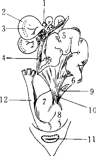 母鸡生殖器官 1.卵巢 2. 成熟卵泡 3. 卵泡斑 4. 漏斗 5. 膨大部 6. 峡 7. 子宫 8. 阴道 9.输卵管背侧韧带 10. 腹侧韧带 11. 肛门 |
