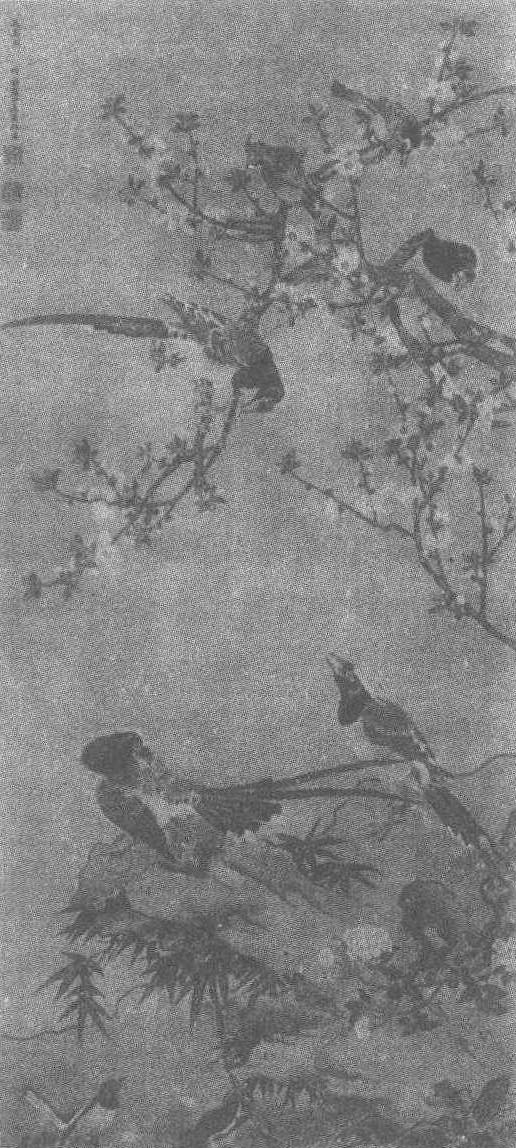| 释义 | 边景昭春禽花木图轴明。边景昭(见《边景昭双鹤图轴》条目)绘。绢本设色。纵137.7厘米,横65.5厘米。上海博物馆藏。此图描绘初春时节山间禽鸟鸣闹枝头的情景。图中坡峦一角,山岩危立,卉草蔓生。几枝幼篁从石隙中探出簇簇绿叶,一茎李枝从右侧伸入图中,老干曲转,新桠舒展,繁花缀满枝头,在细碎的嫩叶衬托下,洁白秀雅,清纯可爱。几只山禽栖止于树枝山石之间,鹇鸟白翎、赤足、长尾,喜鹊黑头、灰背、白腹,有的引颈高鸣,有的转头理羽,有的俯身啄食,色彩斑斓,姿态各异,表情自然生动。此图承继北宋院体花鸟画风,笔法工细,勾勒谨严,设色明丽,构图布景疏密相间,上下呼应。坡石勾染则简放粗重,有马、夏笔意。款署:“武英殿待诏陇西边景昭写。”下钤〈怡情动植〉、〈边氏景昭〉及〈多识于草木鸟兽〉三印。