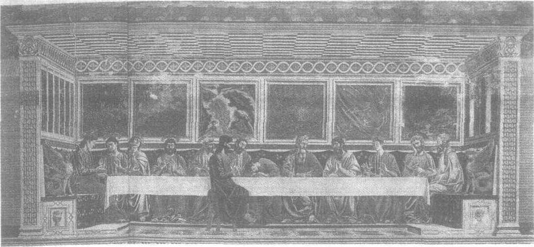 最后的晚餐 卡斯塔尼奥 达·芬奇意识到了这一点,并在1495年开始画他的 《最后的晚餐》时,重新考虑了整个画面构图。基督仍在画面中央,左右围着餐桌坐着他的门徒。在他身后有窗户,透过窗户可以看到远处明亮的原野。从透视分析图来看,格子形状的天花板左右的线,和两侧墙壁上壁挂垂直于画面的线,将它们向纵深方向延长并求出消失点,这点恰好在基督头后远处的地平线上,同时又在画面的正中位置上。这中心焦点控制着我们对着室内的视点。作出视图,横长的画面刚好全部都在其中。所以我们可以将透视学的框架视为人物的背景,在其中的各个部分形成一种严密的比例关系,使整个房间看去像是异常地深长。如果我们将这幅画的上半部分三分之一的地方用手遮住,那么它的构图就会像以前画家惯用的画法那样如同一条横饰带,基督门徒的组合就不会像现在这样紧凑,而基督呈三角形的外形也会突然变得无精打采,不在成为一个物质和精神的中心点。 然而,达·芬奇的天才之处却在于,他不但用透视法构筑起了一个逼真的舞台,而且还表现了众多人物那种戏剧性的心理状态在一刹那间的显现。基督好像在说出几个生死关头的字眼 “你们中间的一个人将出卖我。”而他的门徒们立刻骚动起来,纷纷问:“主啊!是不是我?”基督说完话后,摊开放在桌上的两手,脸上显得很平静,好像有所悟地自语道:“这是命中注定如此的啊”。(暗示基督在最后的晚餐中是要建立 “圣餐的宗教涵意。”)达·芬奇将门徒们都挤在餐桌的一边,而将另外对面 一边全部空出来,这虽然不合乎生活中的常理,但更集中地表现了主题,特别是犹大并没有和其他人隔开,但他强壮阴沉的侧影,却将他从人群中突现出来。关于使徒门的性格描写,达·芬奇在他的笔记中曾经写道: 绘画中最难描绘的是利用手势和四肢的动作来表现人的灵魂,不只是描写人类感情上的一种暂时现象,而且是人类内在精神的整体——这幅画可以视作这句至理名言的最好诠释。 |