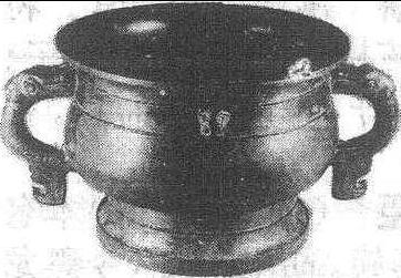 西周昭王十六年 (约前1037),器高18.1、口径16.2厘米。鼓腹,侈口,附高足方座,肩部饰夔纹,足部饰斜角雷纹,间有乳钉纹,方座四面正中各铸有兽头装饰,内底铸铭文三行十六字:“过佝从王伐反荆,孚金用乍宗室宝彝。”记载了昭王南征史实。罗振玉原藏,现藏旅顺博物馆。《小校经阁金文拓本》、《三代吉金文存》、《西周金文辞大系图录考释》著录。