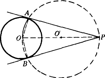 分析 设PA是⊙O的切线,A为切点.则OA⊥PA,所以点A必在以OP为直径的圆上. 作法 ❶连结OP; ❷以OP为直径作⊙O′,⊙O′和⊙O交于点A,B; ❸作直线PA,PB.则PA和PB就是⊙O的切线. 讨论 经过⊙O外的一点P,可以作出⊙O的两条切线. |