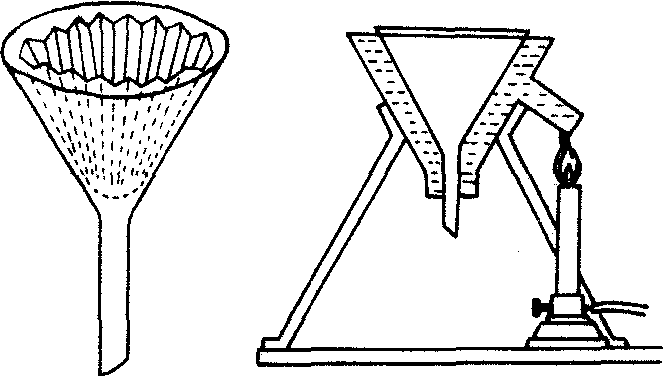 热过滤的目的是防止滤液降温时析出杂质晶体,而混入已析出的晶体中。如将氯化钠和硝酸钾混合溶液加热浓缩,可使氯化钠析出晶体。欲分离出氯化钠,应采用热过滤,以防降温时硝酸钾晶体析出,混在氯化钠晶体中。热过滤采用热滤漏斗,内放玻璃锥形漏斗,玻璃漏斗的颈要短,否则颈的下端遇冷会析出晶体。热过滤装置见图。如果热过滤时出现杂质结晶现象,应将滤纸及上面的晶体放入原液体中进行加热,杂质溶解后再行过滤。 减压过滤又叫抽滤,所用仪器为布氏漏斗和吸滤瓶。参见“布氏漏斗”。 |