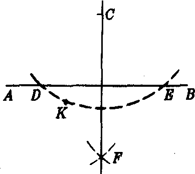 已知 直线AB和AB外一点C.求作 AB的垂线,使它经过点C. 作法 ❶任取一点K,使K和C在AB的两旁; ❷以C为圆心,CK为半径作弧,交AB于D和E; ❸分别以D,E为圆心,以大于DE/2的长为半径作两条弧,两弧相交于F; ❹经过C,F两点作直线CF.则CF就是所求的垂线. |