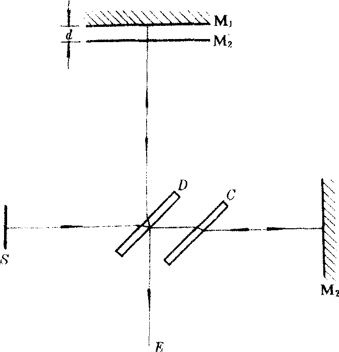 | 释义 | 迈克耳孙干涉仪maikeersun gansheyi一种精密的双光束分振幅干涉仪。1881年,美国物理学家迈克耳孙所设计,并于同年在波茨坦天体物理观象台的地下室里用它进行了以太风的第一次观察实验。1887年,迈克耳孙和莫雷一起,用改进后的干涉仪做了著名的迈克耳孙-莫雷实验。当时所用的干涉仪设计精巧,在仪器中光经过8次反射,光路长达11米,仪器的光学部分安装在很重的大石板上,石板浮在水银面上,可绕中心轴自由转动。迈克耳孙干涉仪的原理如图所示。M1和M2是两块平面镜,安装在互相垂直的两臂(位置与图中光线相同)上,M2固定不动,M1可沿臂的方向来回移动。D和C是两块折射率和厚度完全相同的平行平面板,D安装在两臂的相交处,与两臂的交角均为45°,它的背面镀有半反射膜,称作分光板;C安装在通往M2的臂上,称作补偿板。扩展光源S发出的光,被D分成振幅近似相等的反射光和透射光。反射光被M1反射,再从D透射,向着E处传播;透射光被M2反射,再被D反射,也射向E处。在E处可用肉眼观察到两束光的干涉条纹,如在E处放置物镜,条纹将呈现在它的后焦面上。反射光前后通过D三次,而透射光只通过D一次,但通过C二次,所以两束光通过板的光程相等,C板起补偿板中光程的作用。若M′2′是M2通过分光板D上半反射膜反射所成的虚象,那么,从光程上看,光从M2的反射就相当于是从M2′上反射。所以,可认为这种干涉是以M1和M2为界面的空气薄膜干涉。当光入射到M1或M2上的入射角为i,M1和M2′之间的距离为d,则到达E的两束光的光程差为2dcosi+W′,式中W′为附加光程差,与光在半反射膜上的反射有关。如果M2与M1严格垂直,即M2′与M1严格平行,可观察到等倾干涉,干涉条纹定域在无穷远,是明暗相间的同心圆环。在d增大(或减小)时,可观察到条纹向外(内)移动,每增大(或减小)λ/2,(λ为光的波长),从环的中心冒出(或消失) 一个条纹。如果M2与M1不完全垂直,M2′和M1之间构成楔形空气薄膜,d足够小时,可观察到等厚干涉。在d改变时,可观察到条纹的移动。此时,如用白光作光源,且调节到M2′与M1以小角度相交,那么交线处呈明条纹(设W′=0),而两边对称分布着彩色条纹。