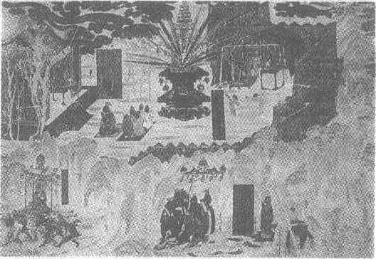 | 释义 | 迎昙延法师人朝祈雨图壁画初唐。纵132厘米,横188厘米。甘肃省敦煌县莫高窟第323窟南壁东侧中层壁画。此图描绘的是隋开皇六年天大旱,隋文帝请昙延法师求雨的情形。图分两层,下层为隋文帝在群臣的簇拥下请昙延法师的场面,文帝的神态和动作都流露出恭敬。左侧绘几个舆夫抬着肩舆行进在山路上。舆内的昙延法师沉稳、自信。舆夫行走的跨步很大,脚步如飞,以示祈求降雨的急切心情。画面的上层巍然高耸的城墙内有庙宇和放光的舍利塔。庙前,文帝受戒求雨。塔前的经篷内法师在与文帝说涅槃经。空中乌云密布,象征降雨,以示祈雨的灵验。此图画面简洁概括,人物的形态、动作与情节发展十分相符,生动传神。作者使用石绿、红褐色晕染,绘城外重叠的翠山,将画面点缀得很美丽。