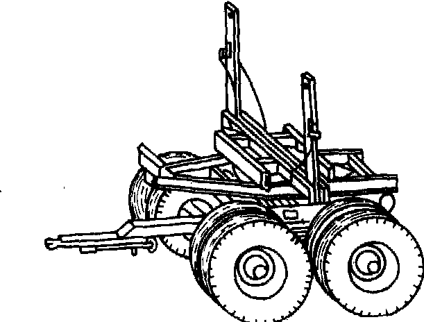 长材挂车 半挂车的一种特殊型。通过木材或辕杆与牵引汽车联结。载运的木材重量由牵引汽车和挂车分担。挂车与汽车之间用辕杆及载运的木材联结时称常联结式。这种挂车也可称为常联结式长材挂车。只用载运的木材将挂车与汽车联结时,称分离联结式。因挂车在未联结之前与牵引车是分离的,所以又称分离式长材挂车(见图)。常联结式长材挂车的辕杆是金属圆管或方形空心管,前端有联结环,能挂在牵引汽车的牵引钩上。辕杆穿过车架,在辕杆的后部设有数个供调节长度用的销孔,车架上有固定辕杆的销孔及销钉,因此可按运输木材的长度,调节辕杆在车架中的位置,使牵引汽车与挂车得到合理的载荷分配。分离式长材挂车没有辕杆,为使空载时牵引方便,设有短牵引杆。装木材时,按木材长度适当地调节牵引车与挂车间距,使载荷分配合理。这种长材挂车要设置调偏装置。如果运材汽车列车直线行驶时,挂车因某种原因出现偏离汽车行驶轨迹现象(称“跑偏”),必须调节挂车的调偏装置,使挂车行驶轨迹与汽车行驶轨迹大致重合或平行,保证行车安全。中国长材挂车分为单轴和双轴,载重量有3、7(8)、10和15(16)吨数种。