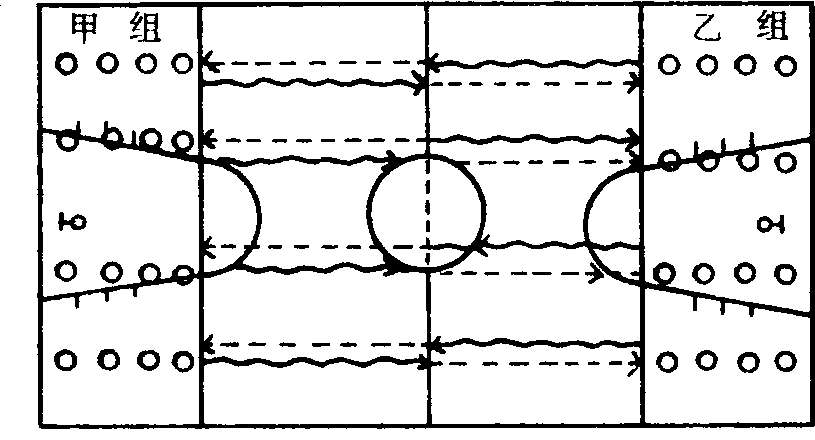 提高控制球能力,发展速度、灵敏素质的游戏。场地 以篮球场的罚球线为准,左右各画一延长线至两边线,作为各组运球的起跑线。器材 篮球4个。游戏方法 将学生分成人数相等的4个队,每队再平分为甲、乙两组,分别排成一路纵队相对站在横线后面,各队甲组排头队员持篮球听教师发令后,持球队员向前运球至中线,用双手胸前传球方法将球传给乙组排头队员,传球后跑至本队乙组队尾。乙组排头队员接球后,按照先运球、后传球的方法,再将球传给本队甲组第二人。如此进行,最后一人做完传球后,原甲组排头队员接到球后立即举过头表示结束。哪个队的排头队员先把球举起则名次列前。