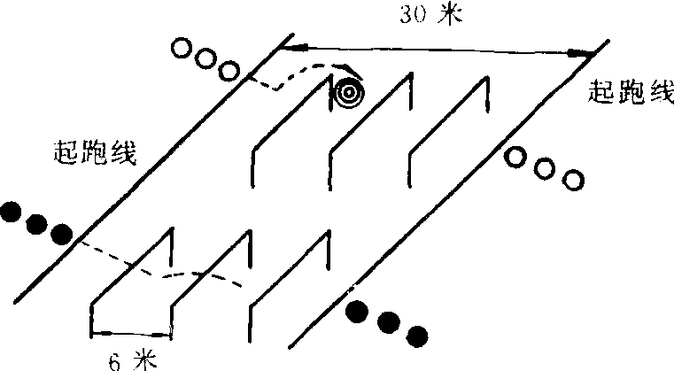 适用于4—6年级。在有障碍的条件下提高学生的接球与运球能力。器材 小篮球2个,高约2米的栏架8个。场地 在操场或空地上画两条相距30米的平行线为起跑线,线之间每隔6米放1个栏架,每队放置4个栏架。游戏方法 把学生分成人数相等的两个队,每队分甲、乙两组,对面站在起跑线后。教师发令后,各队甲组排头手持篮球,向前运球到栏架处,将球抛起使之越过第一栏架,在球落地之前,从栏架下钻过接住,再运球至第二栏架,用上述方法依次通过每个栏架,将球传给本队乙组第一人,自己站到乙组排尾,乙组第一人接球后,用同样方法向甲组方向进行,并将球传给甲组的第二人。以此类推,以先完成的队为胜。