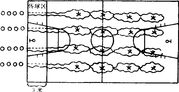 场地 在篮球场距端线3米处各画一条与端线平行的线,两线之间为传球区,并在线前每隔5米放一个标志物。 器材 标志物16个(小旗或障碍架),篮球4个。游戏方法 将学生分成人数相等的4个队,各队排成一路纵队站在端线外。各队排头队员持篮球,教师发令后立即向标志物方向运球,绕过4个标志物后,立即返回继续绕过标志物,运至传球区内将球传给本队第二个人,自己站到队尾。第二个人接到球后按同样方法运球,依次进行。最后一人做完传球后,原排头队员接球立即举球过头表示结束。哪一个队的排头队员先把球举起则名次在前。 游戏规则 听发令或接球后才能起动运球,依次绕过标志物,不得带球跑,运球或接球失误应从失误处重新开始运球,必须进入传球区才能传球。 |
