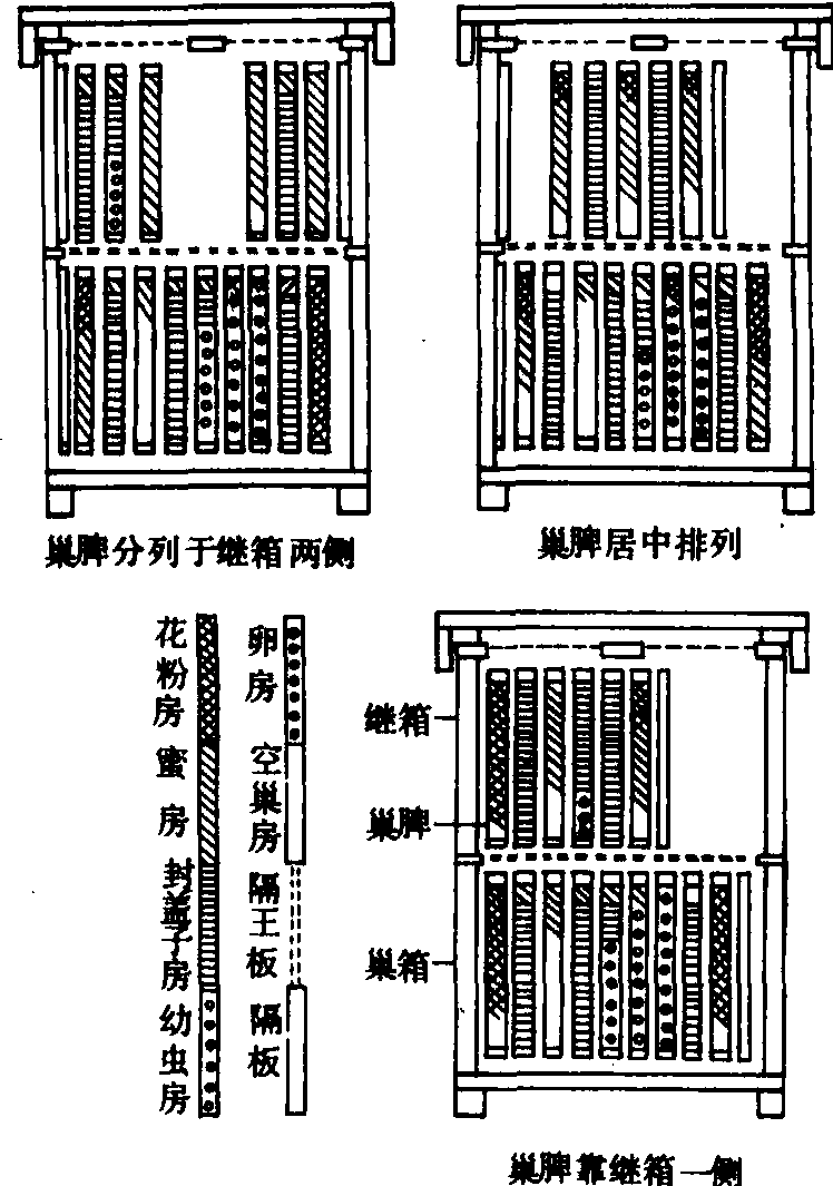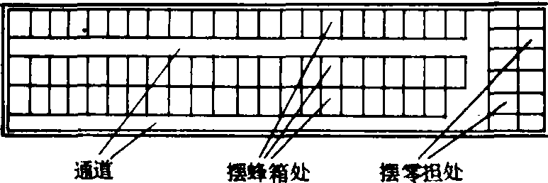 图3 高边车厢装运蜂群平面图 途中管理 弱群低温运蜂管理比较简单,气温13℃以下运蜂,装叠蜂群应防剧震,以免蜜蜂离脾冻僵。零下20~30℃运蜂,车厢宜用棚车,敞车用篷布包裹,运抵温暖地区后及时拆除。 高温季节长途运送强群,如运程短,以夜间运输为宜,途中不停歇,争取午前抵达。运程两天以上,天气酷热,宜在当天或次日午前放蜂,傍晚重装再运;以后每隔42小时再放蜂一次。放蜂后如发生蜜蜂偏集,在装蜂前调整。中途保持蜂群安静,适当喂水,减少阳光刺激,气温高时可往箱壁洒水降温;箱内蜜蜂骚动,以致巢温升高,可放走部分蜜蜂,以免全群被毁。夜间运蜂,可打开巢门,清除死蜂,翌晨关闭巢门。高温季节利用火车棚车运蜂,通道内装放冰块有明显降温作用。到达终点,立即解绳卸蜂,蜂箱摆妥后往巢门内喷以清水,即可启开巢门。 |