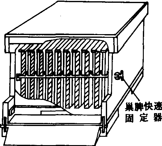 图2 用巢脾快速固定器固定巢脾示意图 关闭巢门 运蜂之前要关闭巢门,炎热季节强群在天黑前进行。先用水或烟驱散在巢门外的蜂团,待全部蜜蜂进巢后再关闭巢门,并及时打开大盖或箱体上的气窗,以便箱内空气流通。 蜂群装叠 运输工具不同,装叠方式不一:❶汽车。先装前部再装后部,箱体紧靠。装完绑牢。 ❷火车。装叠前打扫、冲洗和检查车厢,装过农药者不能装蜂。寒冷的断子期装蜂不留通道,温暖季节须留通道,巢门朝通道;强群叠于通风处,零担装在车厢前进方向的前部(图3)。装毕绑牢。冷藏车装蜂不留通道。 ❸轮船。船面装蜂,横摆数列,巢门朝前。 ❹飞机。装叠要求稳固。