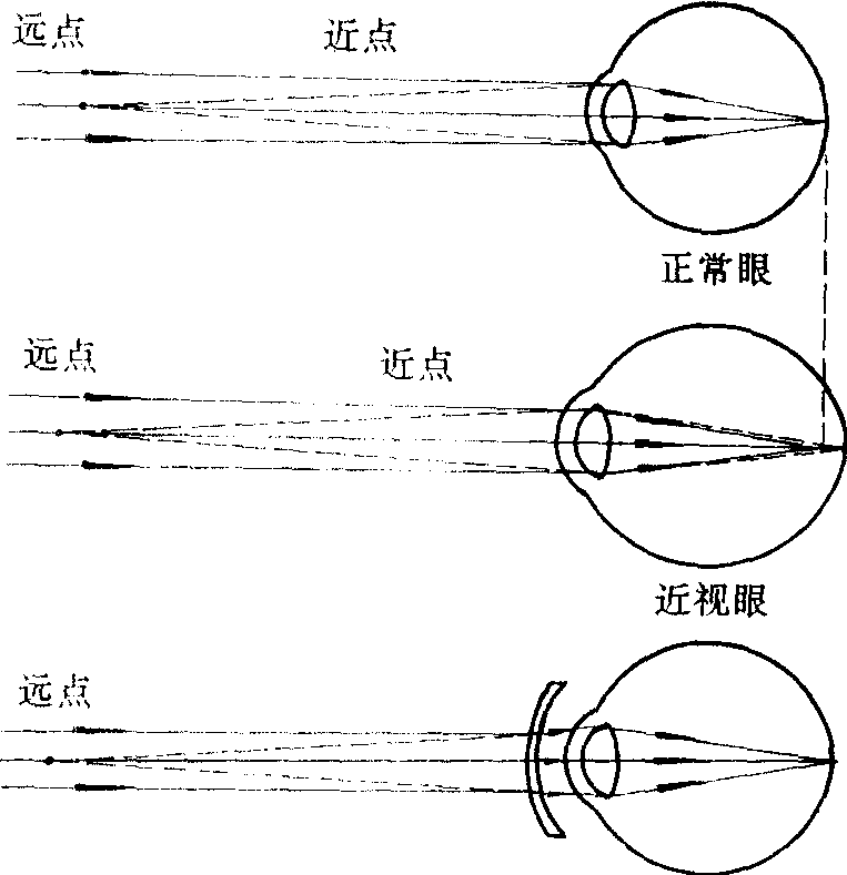 | 释义 | 近视眼jinshiyan一种远点为有限距离的非正常眼。由于眼球前后径过长、角膜曲率变大或者晶状体离视网膜太远,而对远方目标失去聚焦能力。观察远方物体时,成像于视网膜前;观察近处物体时,成像正常(如图所示)。可配戴凹透镜制成的近视眼镜矫正。矫正时,镜使无限远处物体在近视眼的远点处成虚像,再以该虚像为实物,经眼球在视网膜上成实像(如图所示)。近视眼镜的度数可用其焦距(以米为单位)的倒数乘100得到。