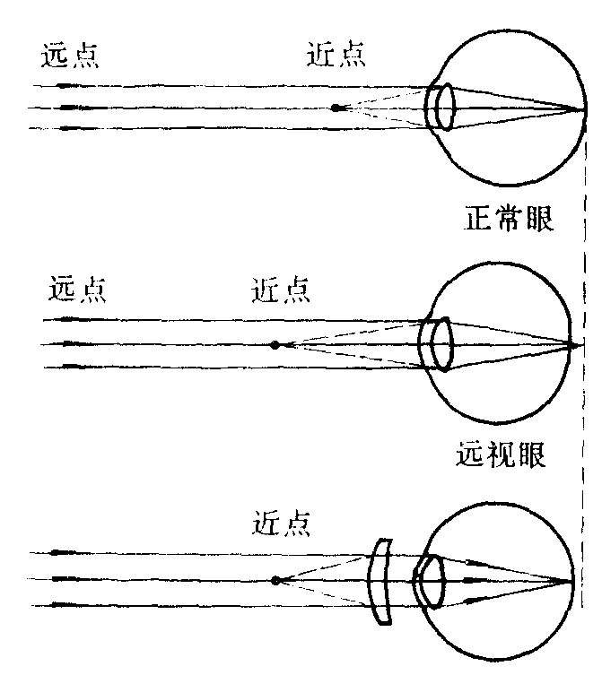 一种近点变远的非正常眼。由于眼球前后径过短、晶状体曲率变小或者晶状体离视网膜太近造成。远视眼观察无限远处物体时,成像于视网膜后,同时近点远移,因而看远,看近皆不清晰。配戴凸透镜制成的远视眼镜可以矫正远视眼,如下图示。