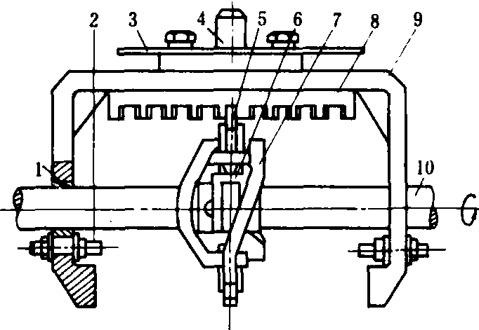 图2 螺旋轴式移箱器 1.移箱轴; 2.移箱滑套; 3.指销; 4.螺旋轴; 5.驱动臂夹子; 6.驱动臂(连接秧箱) 对准式送秧器 结构如图3。在秧爪取秧的宽度范围,秧爪每取秧一次相应送秧一次。送秧叉由曲柄连杆机构带动。当曲柄等速回转时,通过连杆带动摇杆上的送秧叉作往复运动。当移箱器移箱时,送秧叉退出秧箱; 送秧叉送到秧箱最前点并开始后退一定距离后,秧爪进入秧箱取秧。为适应不同秧苗和调整送秧量,送秧叉与秧箱底板的垂直距离即送秧高度和送秧叉的前止点位置是可以调整的。适用于拔取苗插秧机。