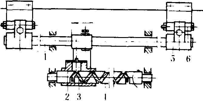 图1 转盘齿条式移箱器 1.齿条架轴套; 2.锁定卡顶开销; 3.箱体壳; 4.移箱插头; 5.移箱盘体; 6.锁定卡; 7.换向器(带左旋和右旋螺旋条); 8.齿条; 9.齿条架; 10.移箱器轴 转盘齿条式移箱器移距准确,定位可靠,移箱省力。适用于拔取苗机动插秧机。 螺旋轴式移箱器 螺旋轴式移箱器由带有左右螺旋槽的螺旋轴、与秧箱连接的指销及螺旋轴的传动机构组成(图2)。螺旋轴由齿轮传动连续移箱,转过一定的角度,指销在螺旋槽内横向移动相应的距离,带动秧箱作横向送秧。改变传动速比,可以调节秧爪每取秧一次的相应移箱距离。移箱两端的停歇可在螺旋槽两端留出一次移箱的转角范围的直槽解决。这种移箱器装设间歇机构也可用于间歇移箱。 送秧器 按送秧范围和送秧时间分为对准式和整体推送式。为了提高对带土苗的送秧能力,日本有采用橡胶输送带作纵向送秧的新机型。在秧箱下部约占1/4秧箱长度的范围安装有几乎等于秧箱内宽的带橡胶钉刺的橡胶输送带,当输送带向前运动时即可带动秧苗前送。但制造成本较高。